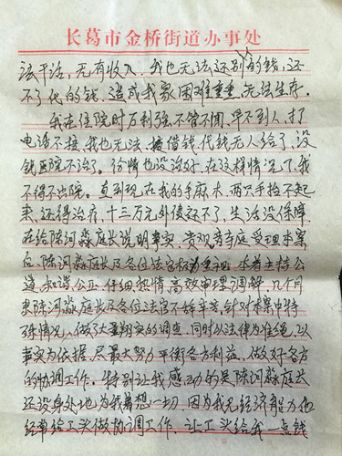 2015年12月28日下午,在河南省新郑法院院领导信访接待办公室,长葛市官亭乡官亭村农民董某向法院副院长杨慧霞送来三张皱巴巴稿纸写成的感谢信,感谢新郑法院观音市法庭庭长陈河淼,并道一声:法官辛苦了,送上了真挚的谢意!这也算是我送给法官“元旦”的礼物。